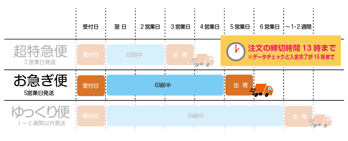 完全なデータをお送りいただくのが15時を超える場合は、納期がプラスされます。