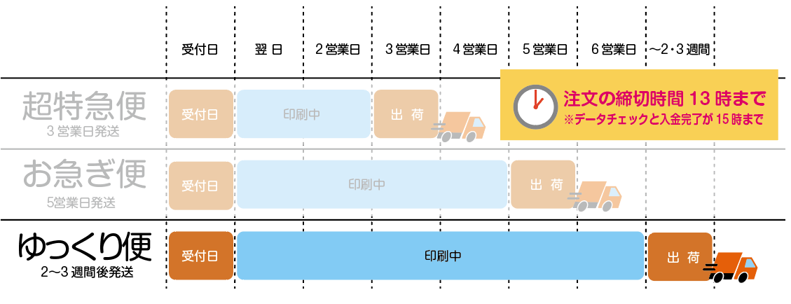 完全なデータをお送りいただくのが15時を超える場合は、納期がプラスされます。